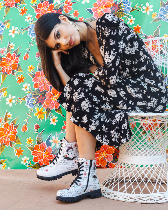 Nuestras botas inspiradas en Frida Kahlo fusionan tradición y modernidad: siluetas atemporales reinventadas con estampados audaces, colores vibrantes y detalles que evocan la esencia de la artista. Son una invitación a vestir tus ideales, tu creatividad y tu amor por la autenticidad.